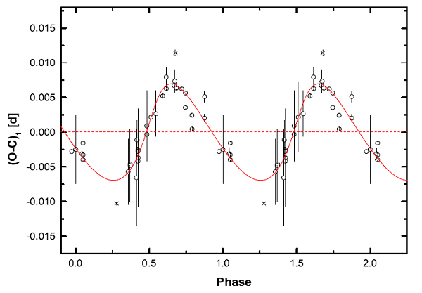 食双星天猫座CN处于由三颗光谱型完全相同的子星组成的三星系统中,但这三颗子星是否真正有物理上的联系以及它们的物理和轨道特征等仍不清楚。为研究它们的轨道特征和探讨密近双星的形成演化,研究人员利用云南天文台1米和60厘米望远镜对其进行了近五年的不间断监测,获得了天猫座CN的系列掩食极小时刻,并结合SWASP、KWS等空间观测资料,对该系统的轨道周期变化进行了详细的分析研究。发现该食双星的掩食光变到达地球的时间呈现周期性的变化(光时轨道效应,见图1),揭示了它们是物理上有联系的“三胞胎”三星系统,第三天体围绕中心食双星做偏心轨道运动。