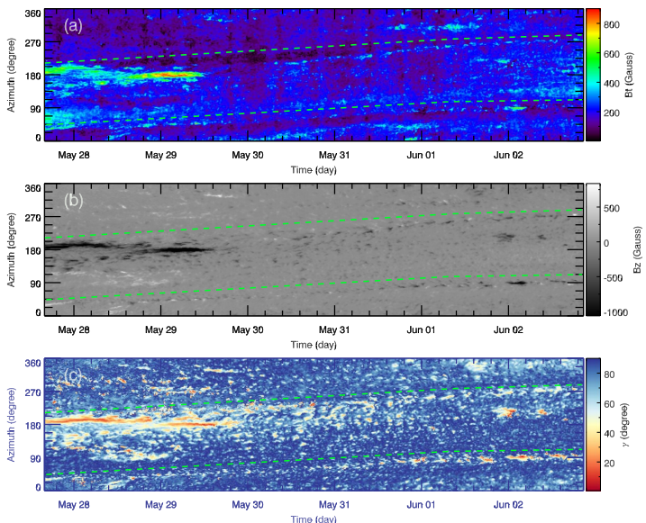 图2展示了紧裹黑子的椭圆切片记录的有半影和无半影区域产生的运动磁结构的矢量磁场性质。图(a)-(c)分别是横向磁场强度、纵向磁场强度、磁场倾角切片图,绿色虚线标记了无半影区域上下两个开口向外运动出的运动磁结构的踪迹。