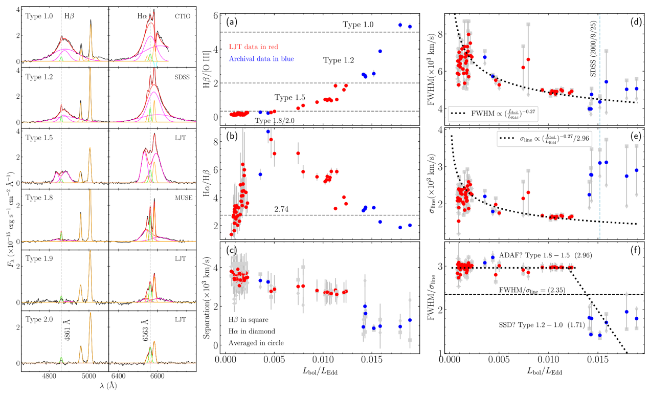 在45年的时间尺度上,在1000倍爱丁顿比(吸积率)的变化空间中,在可用的数据资料下,研究人员穷尽分析Mrk 1018宽发射线特性(见附图),取得如下成果:发现吸积率直接驱动了谱型转换和发射线形状转换;发现宽线巴尔莫减缩的单调增转向单调减现象;发现宽发射线辐射区在低吸积率情形下的径向长期维里化现象。这些现象对认识变脸活动星系核和宽发射线辐射区具有价值,研究人员接下来的工作将继续探索这些新现象的普遍性。