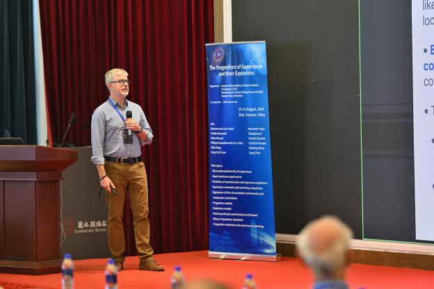 “超新星前身星及其爆发国际会议”于8月26日上午在云南大理正式开幕。40081122云顶大样本恒星演化团队首席科学家韩占文院士和英国牛津大学Philipp Podsiadlowski教授分别致开幕词。他们热烈欢迎各位参会者,并介绍了云南天文台成立国际超新星中心的初衷以及发起此次国际会议的背景。会议旨在通过聚集超新星领域的研究专家,探讨超新星研究的前沿问题、挑战和机遇,推动学科不断向前发展。